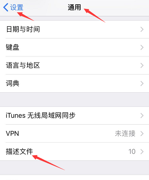 步骤2:依次进入您手机的“设置->通用->描述文件”
